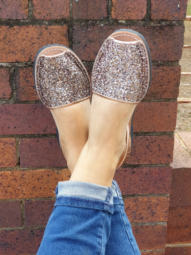 Step into a dreamy shimmer with our Opal Glitter Avarcas. These beauties feature a soft pink glitter base with hints of blue and gold that catch the light at every angle. Whether you're dressing up a casual outfit or adding sparkle to an evening look, these sandals will have you glowing all day long.